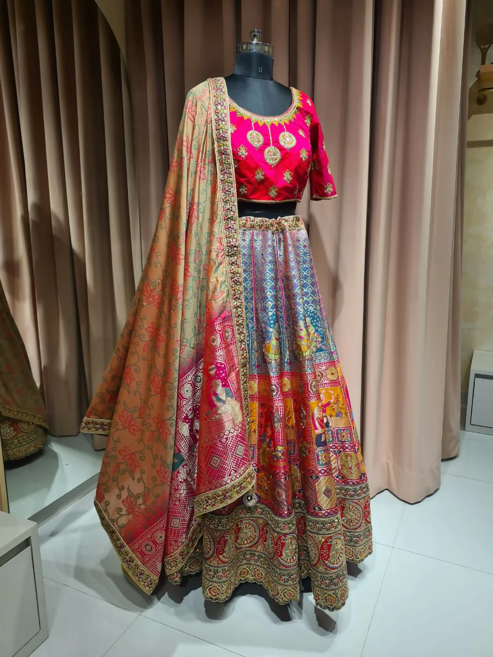 The lehenga features exquisite multicolor embroidery inspired by traditional Indian artistry, highlighted with intricate motifs and royal patterns. The vibrant pink blouse pairs beautifully with the richly detailed skirt, while the beige-golden dupatta adds a regal finishing touch.