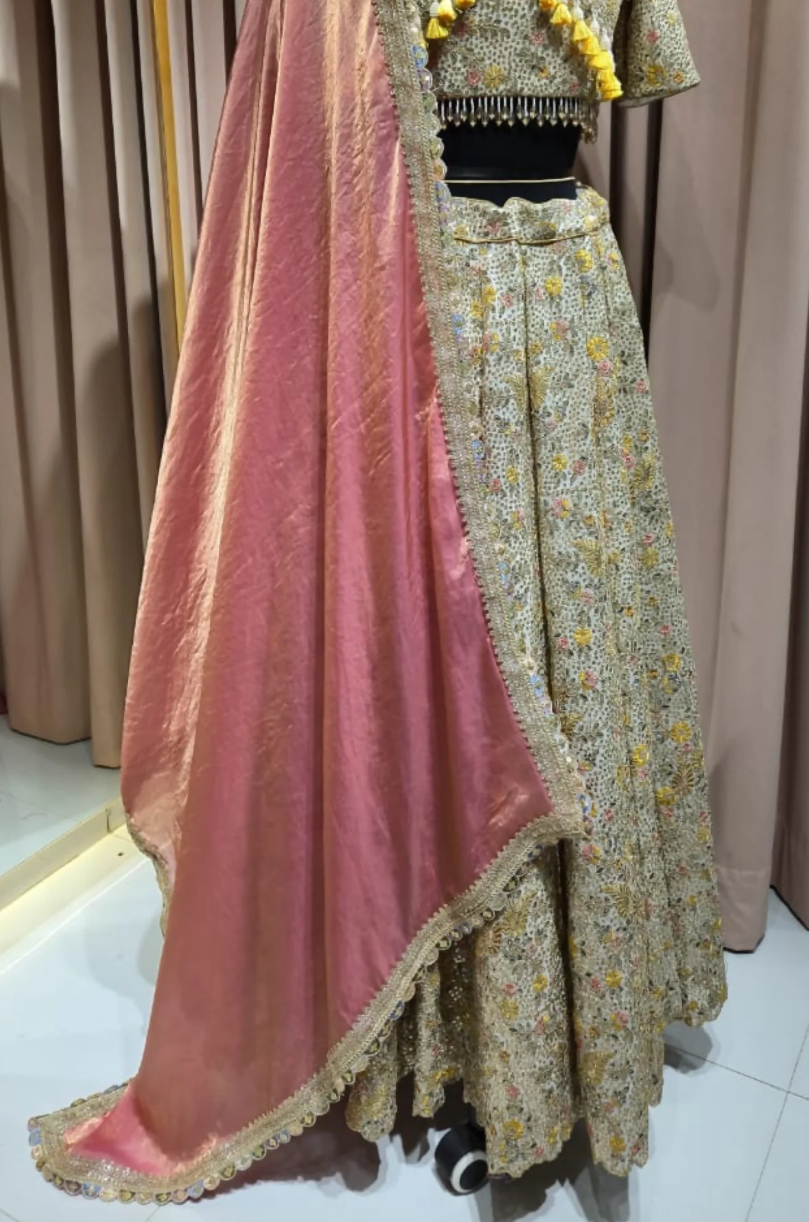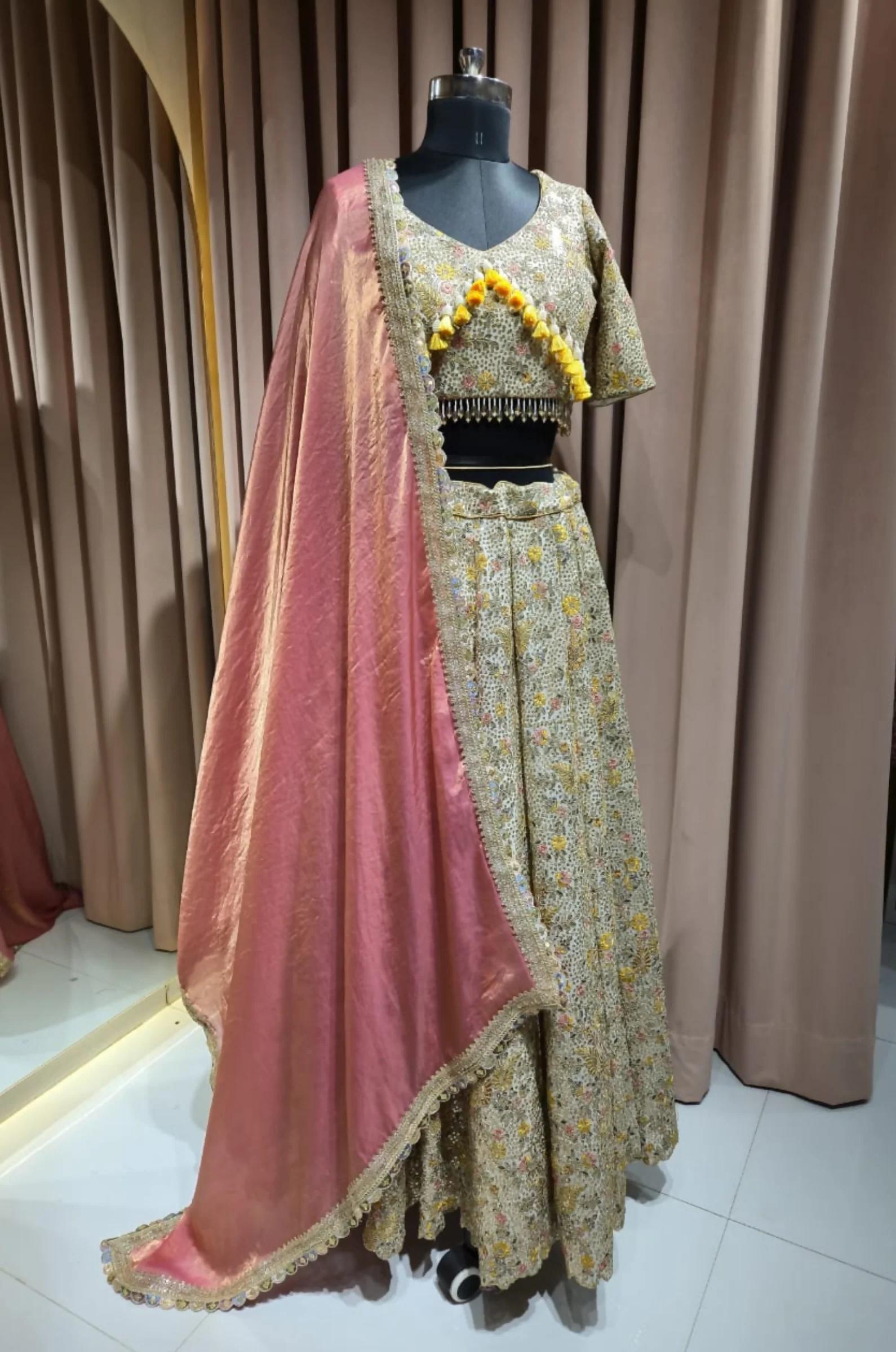 Elevate your festive look with this elegant party wear set in a soft pastel palette. The ensemble features a gently flared skirt and a matching blouse adorned with intricate floral embroidery. A contrasting pink dupatta with delicate pom-pom detailing adds a vibrant touch. Perfect for weddings, receptions and special occasions.