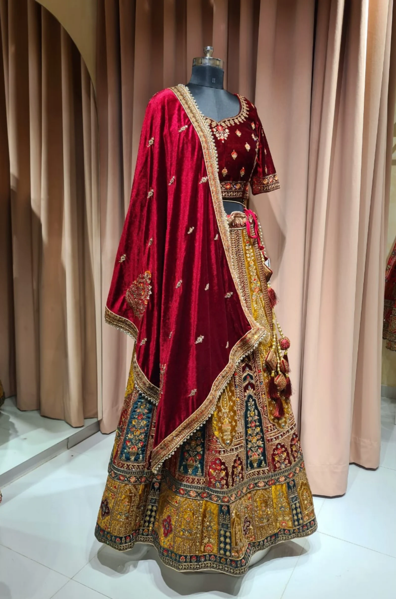 A timeless bridal ensemble for the modern bride who loves tradition. The rich maroon velvet paired with mustard embroidered lehenga panels and dual dupattas makes it perfect for weddings, receptions, and royal festivities.